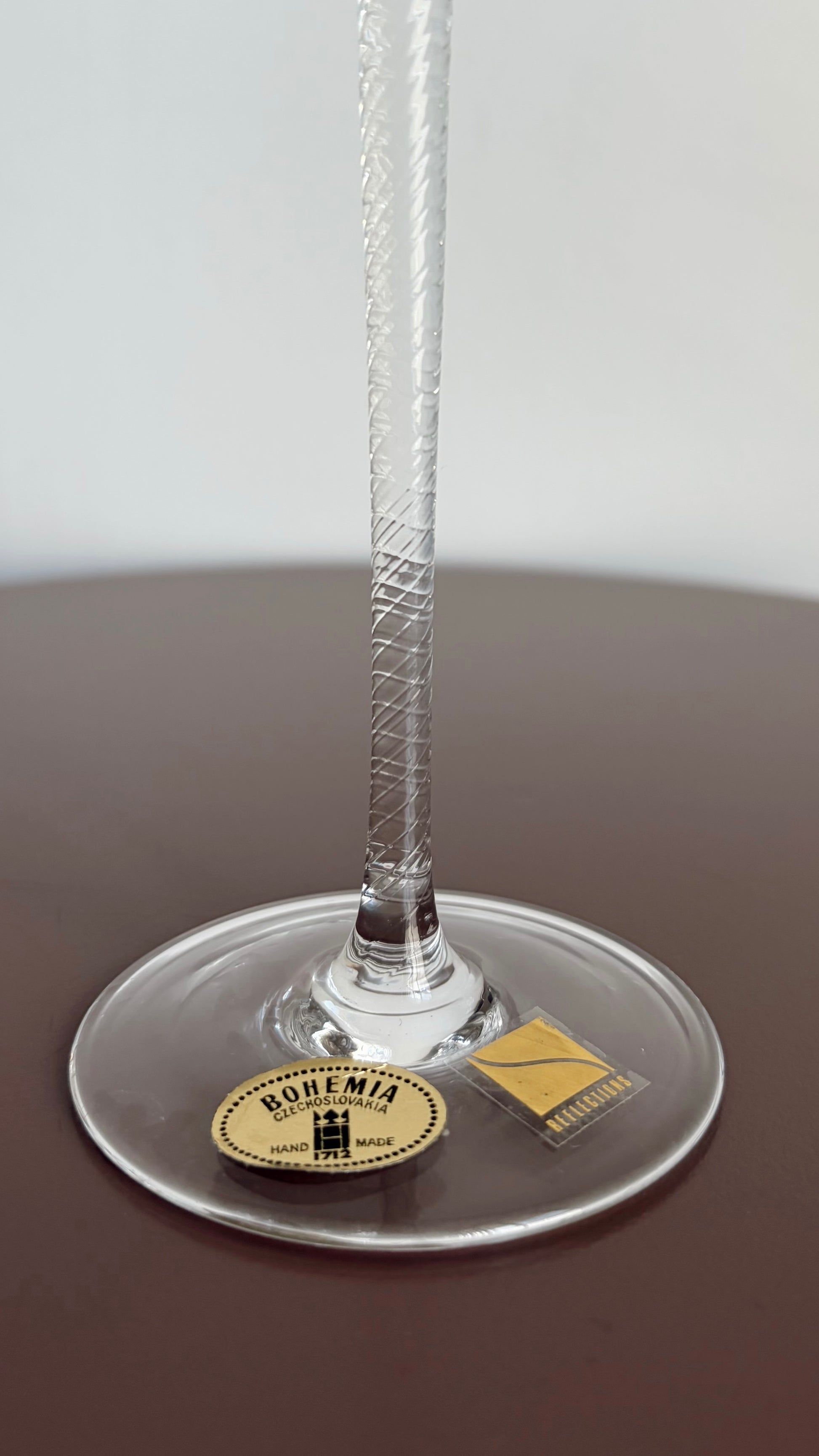 This is a vintage Bohemian crystal candlestick produced in Czechoslovakia before 1993, carrying the original Bohemia Czechoslovakia and Reflections export labels. The stem is mouth-blown and hand-pulled, giving it its twisted design. Clear crystal, sculptural form, and a balanced silhouette make it an easy standalone styling piece for shelves, consoles, or dining tables.