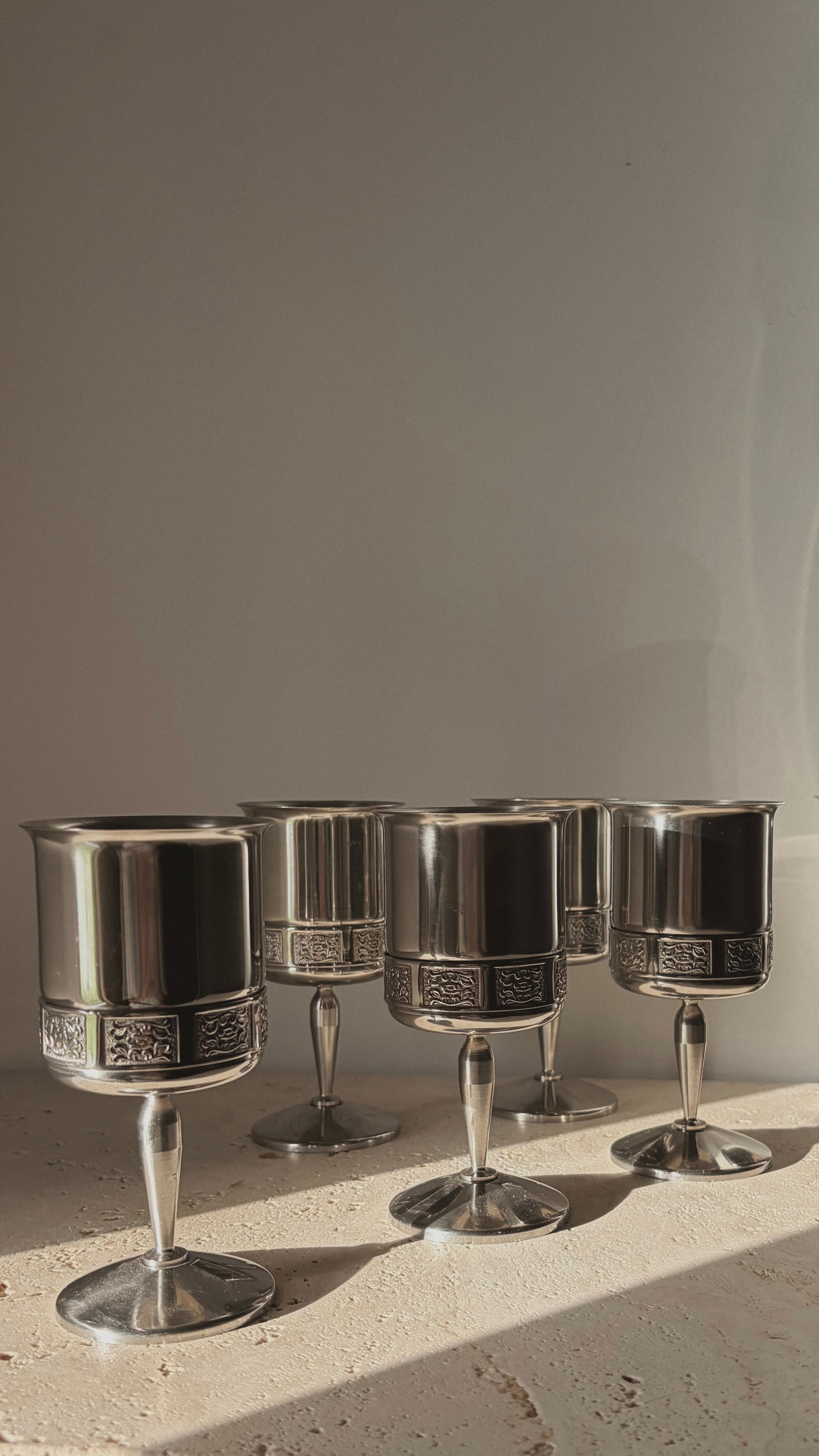 vintage stainless steel goblets featuring an embossed ornamental band. Classic mid-century silhouette with a durable, weighted stem. Ideal for wine, display styling, or adding a sculptural metallic element to shelving and tablescapes.